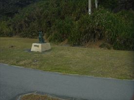 座間味村役場。記念碑は鰹漁発祥の地 |
