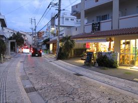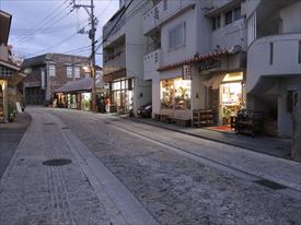 電信柱の右はやちむん、シーサー、染織物を扱うまるかつ1号店、その右はガラス工芸のまるかつ2号店 |