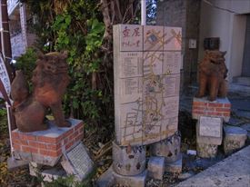 赤の看板は新垣製陶所 新垣勲窯、向かいの黒の看板は新垣陶苑 |
