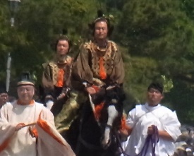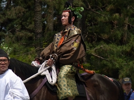 ここから警衛の列 検非違使志(けびいしのさかん) 検非違使庁の役人で警察司法の 担当者。六位の武官。 薄い藍色の装束で舎人(とねり) の引く馬に騎乗、看督長(かどの おさ)、火長(かちょう)、白丁(は くちょう)、如木(にょぼく)など 下役を率いて行列の警備にあた る。 |