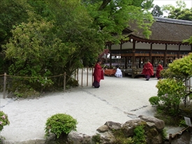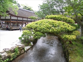 左の建物は舞殿(ならの小川の橋の上にあるので橋殿ともいう)。ここで勅使が奏上する。 |