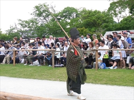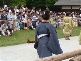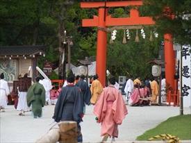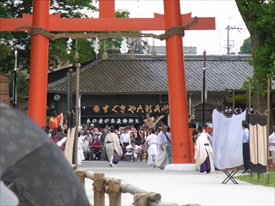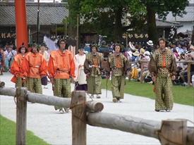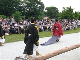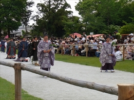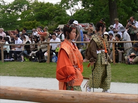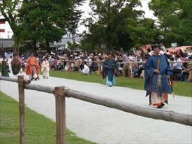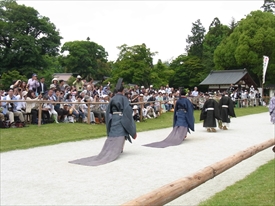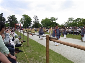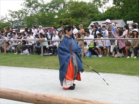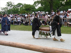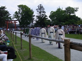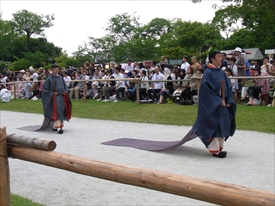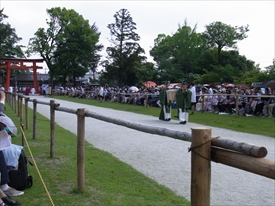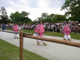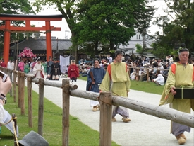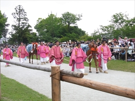 乗尻は次の儀式を経て葵祭に挑む 競馬会足汰式(くらべうまえあしぞろえしき) 5月1日に5月5日の競馬会神事(くらべうまえじんじ)に出場する馬の組み合わせを決める儀式。烏帽子に白装束姿の乗尻が、ならの小川で足を清めて騎乗に備える。神職が馬の健康状態や年齢を確認した後、馬場で乗尻の姿勢や馬の速さが比べられ、「上の上」から「下の下」までの格付けが行われる。 賀茂競馬(かもくらべうま) 5月5日寛治7年(1093年)に始まった、乗馬発祥の地・上賀茂神社ならではの神事。それぞれに舞楽装束を身に着けた乗尻が左右に分れ、馬に乗って儀式を行う。続いて、2頭の馬が馬場で駆け競う。その様子は「徒然草」等にも記され、京都市登録無形民俗文化財に登録されている。 |