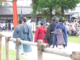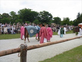 走馬の儀で走る2頭の馬が、馬部(めぶ)に曳かれて歩く。 |