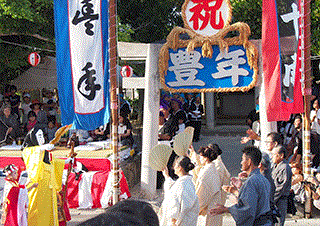 飾墓御嶽(カツァルパカオン)毎年7月31日に豊年祭が営まれる 五穀豊穣に感謝し、来夏世(クナツユ:来年の夏)の「弥勒世果報(ミルクユガフ:弥勒菩薩に守られた平穏で実り豊かな世)」を祈念する。亜熱帯性気候の石垣島では3期作が可能で、3月頃に田植えをした1期目の稲が6月ごろに収穫になり、この時期に豊年祭が行なわれる。 御嶽も祭りも白保の文化財に指定されている |