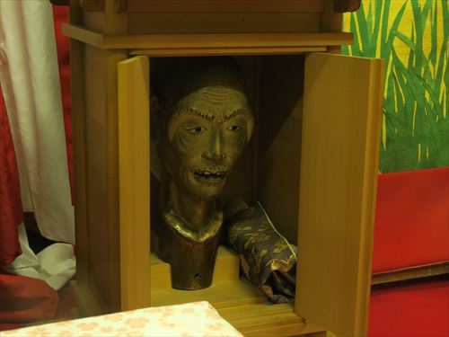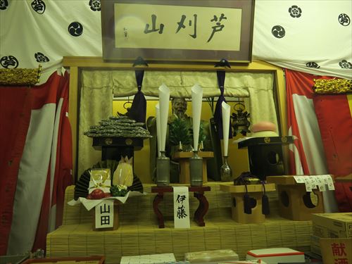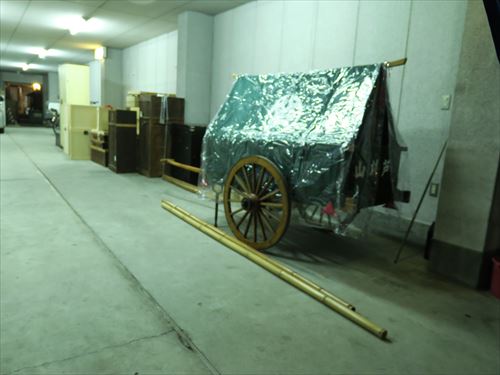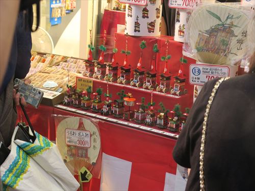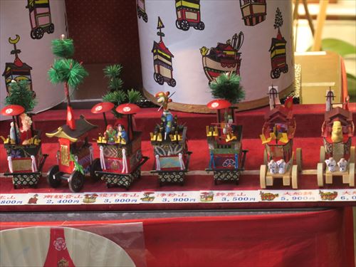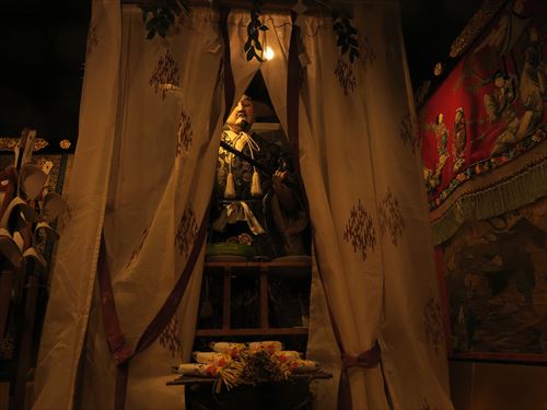 伯牙山:「琴破山」ともいわれる。山の御神体(人形)は中国の周時代、琴の名人伯牙とその友人鍾子期との物語に取材、伯牙が鍾子期の死を聞いてその琴の絃を断ったという故事をあらわしている。人形は手に斧を持ち前に琴が置かれている。人形には「金勝亭賽偃子」の墨書銘があり、天明以降の作と考えられている。前懸には上下詩文、中央に人物風景の有名な「慶寿裂」をかけその下に龍文様の錦を用い、さらに人物図の押絵切付の水引によって飾っている。胴懸は花卉尾長鳥文様の綴錦で、見送には「柳絲軒」在銘の仙人図刺繍を用いている。蝶型の角金具は珍しい意匠。 |