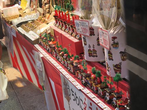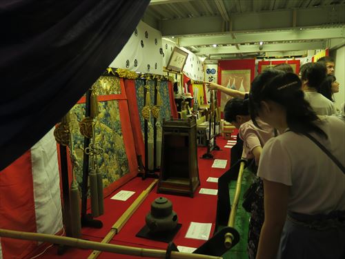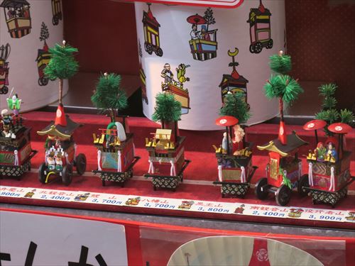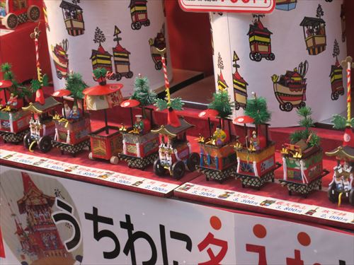 上の段、左から月鉾、函谷鉾、菊水鉾、鶏鉾、南観音山、北観音山、放下鉾、長刀鉾 |