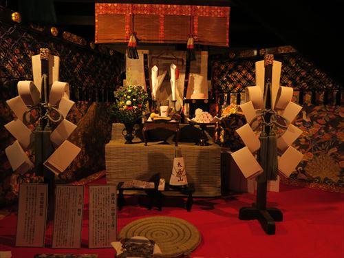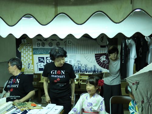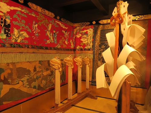 郭巨山:中国の史話二十四孝の一人郭巨釜掘りの故事にちなんで造られ「釜掘り山」ともいわれる。山に飾る御神体(人形)の郭巨と童子は寛政元年(1789)金勝亭九右衛門利恭の作で前懸は天明5年(1785)製の唐美人遊楽図の絽刺、胴懸は石田幽汀(1721~86)の下絵による呉道子描龍図と陳平飼虎図の刺繍で天明5年松屋源兵衛の作、見送は文化12年(1815)製で円山応震(1790~1838)の下絵による山水仙人図であったが、昭和58年から新しく上村松篁原画による秋草図前懸、花の汀図および春雪図胴懸、都の春図見送の綴織を順次新調した。後懸は阿国歌舞伎図綴織と古後懸に天明5年改修の黒ビロード地福禄寿図刺繍がある。この山に限って桐桜菊の欄縁の下に金地彩色宝相華文様の乳隠しが用いられ、また屋根覆いをかけている。 | |
