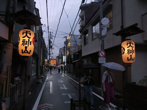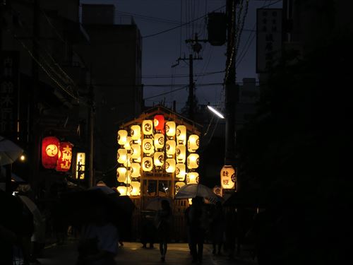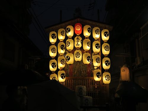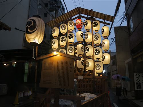 四条傘鉾:織物の垂りなどをつけた傘と棒ふりばやしが巡行する古い鉾の形態である傘鉾の一つで、応仁の乱以前に起源をもち、傘の上には御幣と若松を飾る。明治4年に巡行に加わって以降と絶え、昭和60年に町内の人々の努力が実り傘鉾の本体が再興され、昭和63年から巡行に欠かせない踊りとはやしが復元され、32番目の山鉾として巡行することになった。なお、踊りとはやしは、室町時代に京都から広まった風流踊で、今も滋賀県の滝樹神社に伝わる「ケンケト踊」を参考に復元したもの。 |