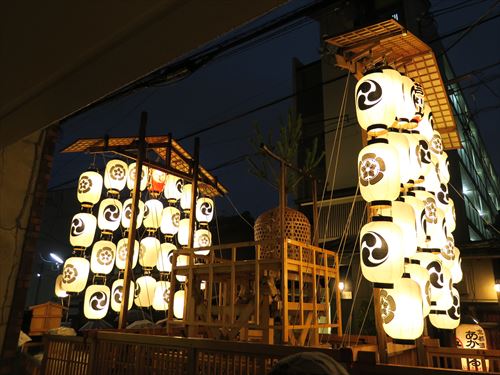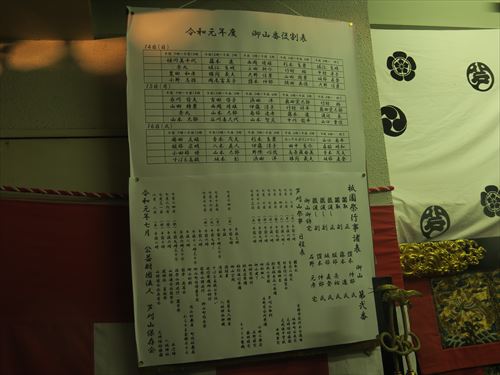 下の段、左から長刀鉾、蟷螂山、芦刈山、木賊山、函谷鉾、鈴鹿山、綾傘鉾、伯牙山、菊水鉾、油天神山、太子山、保昌山、鶏鉾、白楽天山、四条傘鉾、孟宗山、月鉾、占出山、霞天神山、放下鉾、山