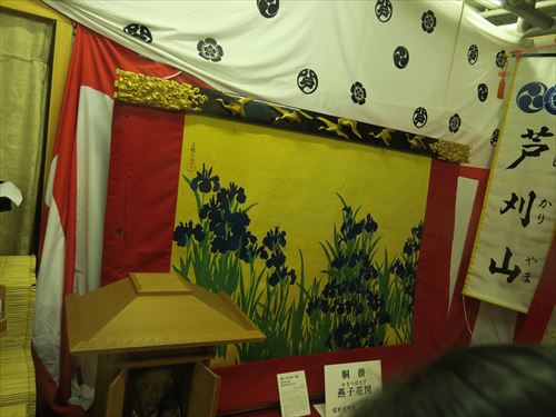 芦刈山:謡曲「芦刈」に基づく。故あって妻と離れて難波の浦で芦を刈る老翁が、やがて妻との再会をはたす夫婦和合の姿をあらわす。御神体(人形)の旧御頭は天文6年(1537)七条仏師運慶の流れをくむ康運作。天正17年(1589)銘をもつ重要文化財指定の「綾地締切蝶牡丹文片身替小袖」は山鉾最古の衣装。現在の前懸と見送は山口華楊原画の段通「凝視」(1986)と綴織「鶴図」(1985)、胴懸は尾形光琳原画の「燕子花図」(1994)。欄縁の彫金飛雁の錺金具は明治36年(1903)川辺華挙の下絵で藤原観教作。旧胴懸の「鶴亀蜀紅文絲錦裂」(江戸時代)をはじめ、「獅子蜀紅文繻珍小袖」(江戸時代)、古い見送など貴重な染織品を多く残している。 |