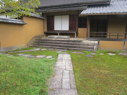 左の写真の奥の一の間から古書院の正門の御輿寄への道、ただし左の写真の道とは別の道で写真を撮った位置で参観者は行き止まり。奥が月波楼の土間 |