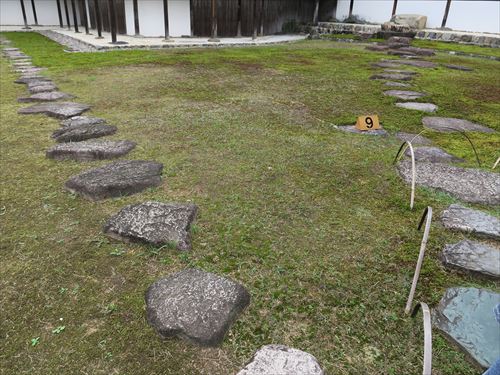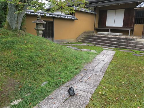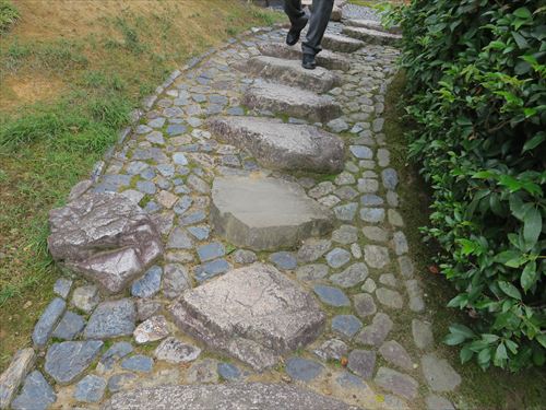御輿寄の「真」の延段(切石のみを組み合わせた延段)。おさらいすると外腰掛の「行」の延段は切石と自然石を交えた延段、笑意軒の「草」の延段は自然石ばかりを固めた延段。灯籠(24/24)はキリシタン灯籠(7/7) 。関守石は日によって位置が変わるらしい |