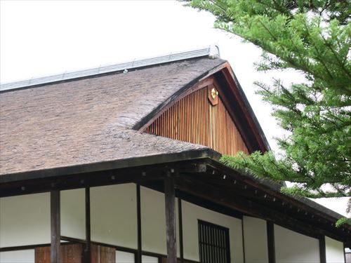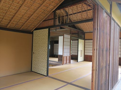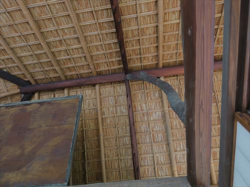 一の間以外は化粧屋根裏として、竹垂木、竹木舞(垂木の上に横に渡し屋根裏板などを受ける細長い材)、葭簀(よしず)の野地(屋根を葺く材をのせる下地の板)からなる屋根裏をそのまま見せる。直線的な材が多い中で、棟木を支える束に1本だけ皮付の曲がった材を用いているのが目立つ。 |
