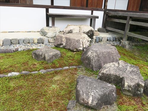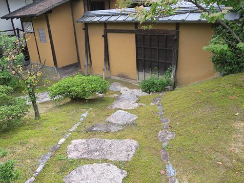 中書院の高い床下は催事の雑役に従う地下の人々の控えの場として使われ 苔庭に打たれた飛石は地下の人々の通路であった。 |