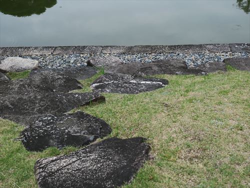 月波楼の南側にある蹲(6/7)と灯籠(22/24)。灯籠は松の影で見えにくい |
