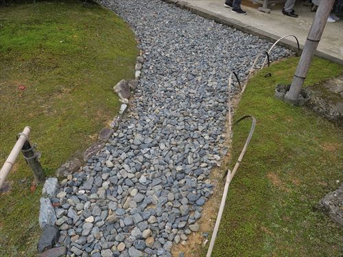 中書院の東は苔庭に変わり 芝庭とは一直線にいけ込んだ敷瓦でくっきりと区画され 建物に沿って直線的に折れ曲がる雨落ちの溝と その間を真っ直ぐに伸びる飛石が整然と並んでいる。雨落ちは両側に小石を並べて縁をとり その間に砂利が入れてある。