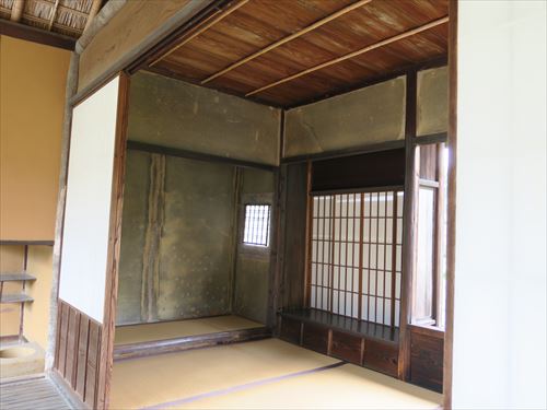 古書院から月波楼は東から入り、写真のように手前が「口の間」、奥が「中の間(二の間)」を見て、南側(写真では左)にある入口に向かう。なおこの口の間のみ低い切妻屋根になっている。 |