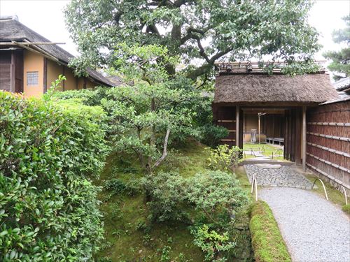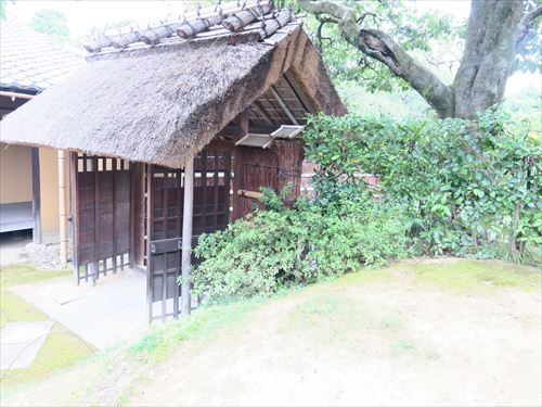 左の写真を撮ったところから古書院の方を見る、右の戸から古書院の正門の御輿寄へ続く。左に行き止まりを示す竹の柵がある。 |