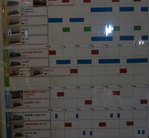 レイアウトの列車の時刻表。同時に5列車が走る |