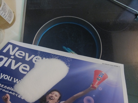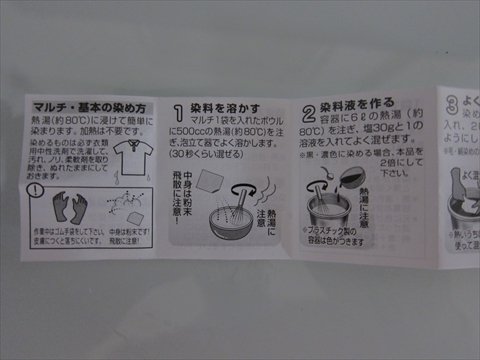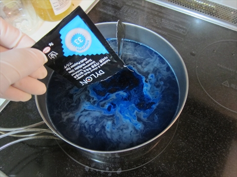ステンレスのコッヘルにお湯を沸かしてダイロンを入れる。手を染めないようにゴム手袋装着。説明書には500ccで溶かしてから6ℓの熱湯にそそぐとあるが700ccぐらいで溶かしたものをそのまま薄めず利用。 |