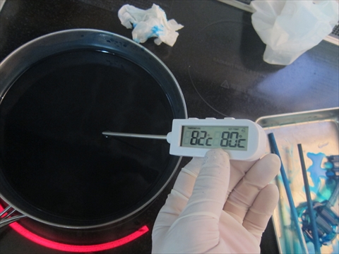 今回のために買った温度計。-50℃から300℃まで測れる。82℃まで加熱。加熱スイッチを切ってパーツを再び投入。 |