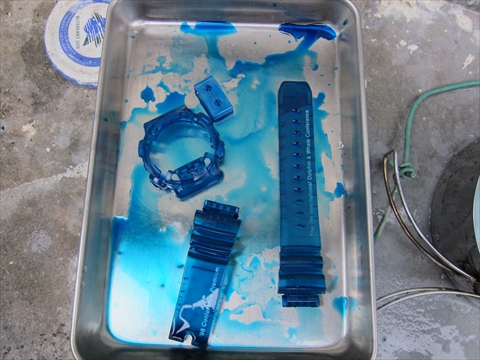 染めるにあたって参考にしたHP(Revy G-SHOCKのベルトを染めてみた!)でも使われたダイロンのマルチ、色はキングフィッシャー、もう一つ濃いのは |