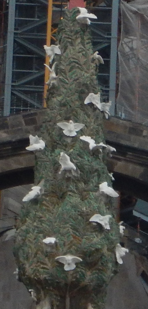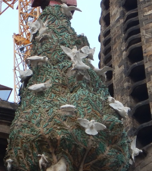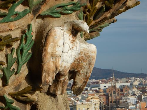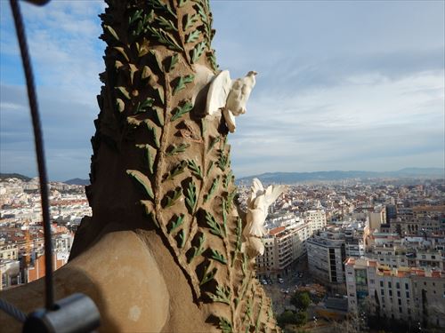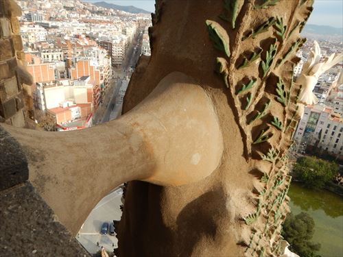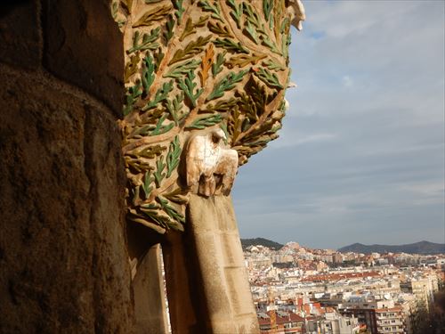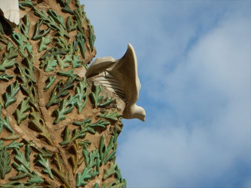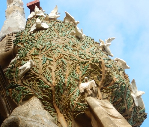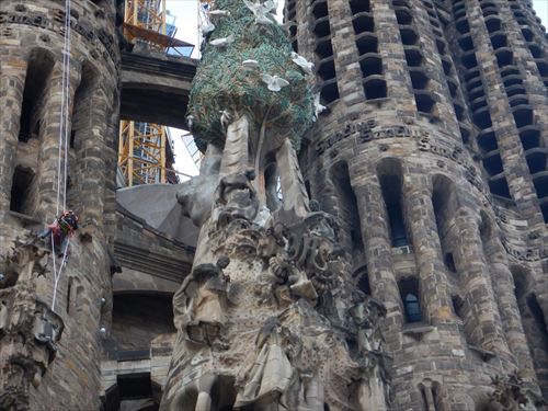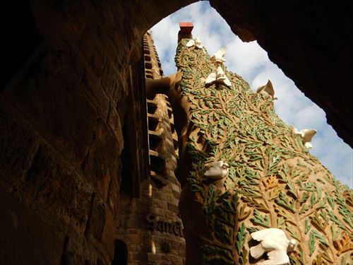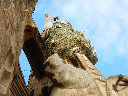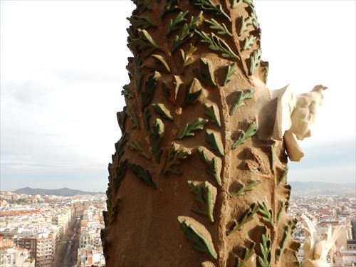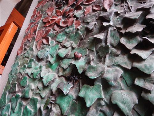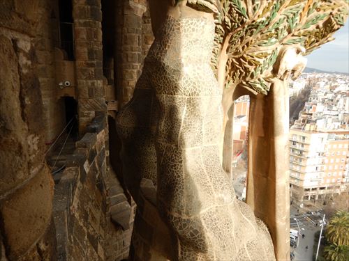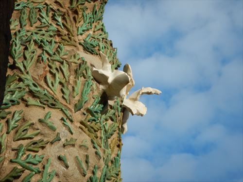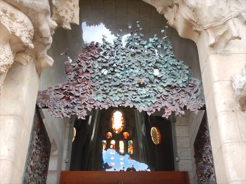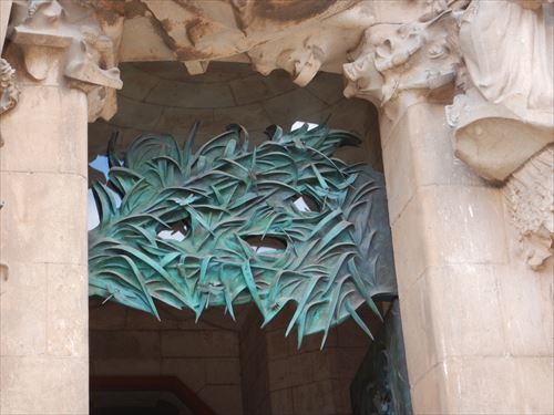 ガウディの「一度、石を置いてしまうとそこに草が生えることはなくなってしまう。動物たちだってそこにもう生きられなくなってしまうんだ。だから、その命までを奪ってする「建築」は花や動物に対する敬意を忘れてはならないんだだ」という意思を継いでいる 葉の中にさまざまな昆虫が見える |