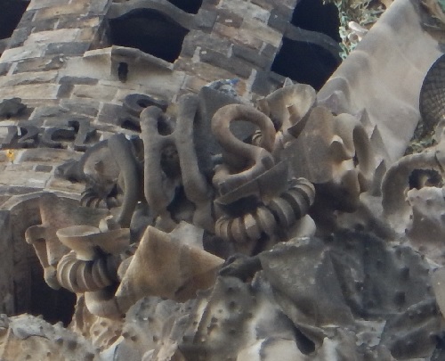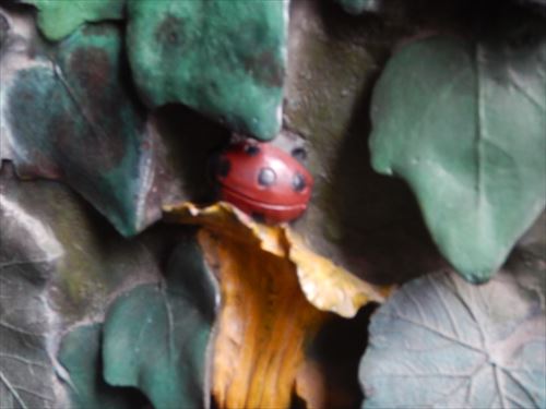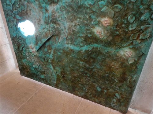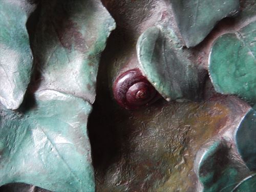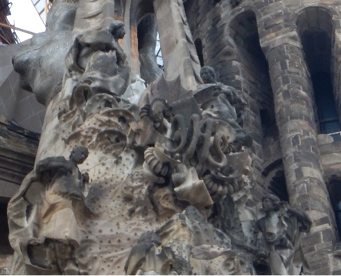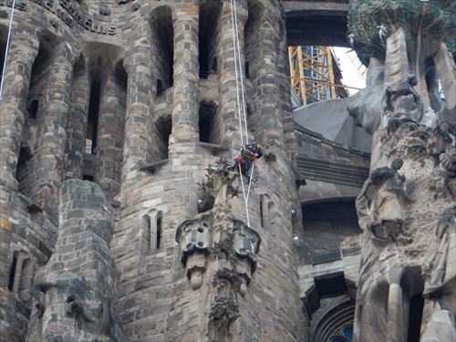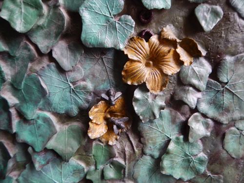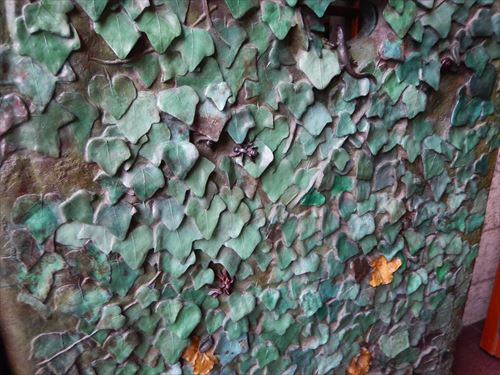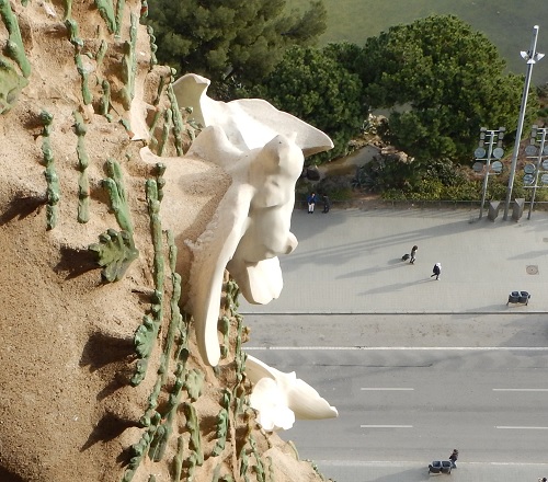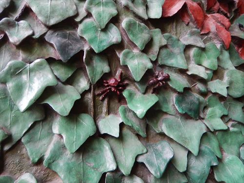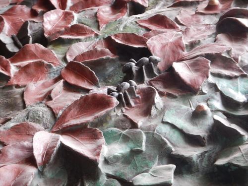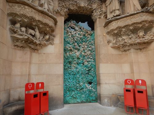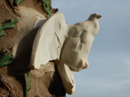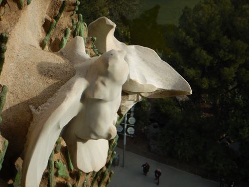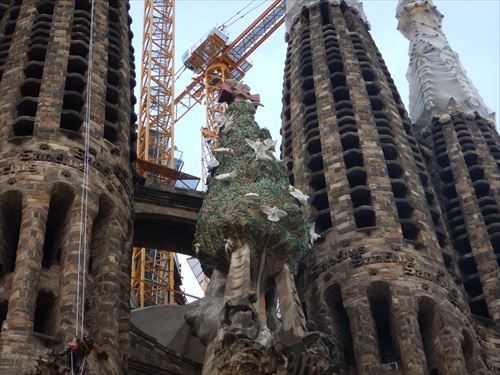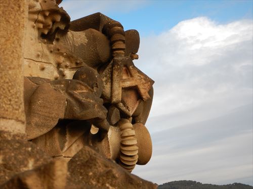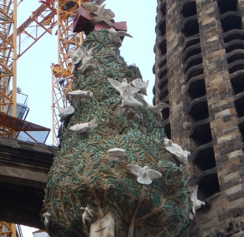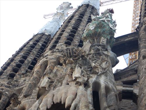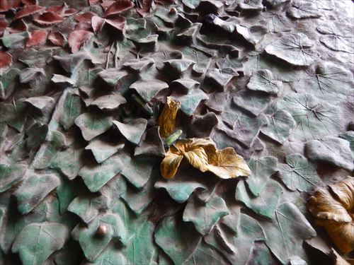 ガウディの「一度、石を置いてしまうとそこに草が生えることはなくなってしまう。動物たちだってそこにもう生きられなくなってしまうんだ。だから、その命までを奪ってする「建築」は花や動物に対する敬意を忘れてはならないんだだ」という意思を継いでいる 葉の中にさまざまな昆虫が見える |