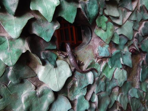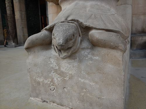 柱は雨樋の役割を果たしており、雨の日は柱を通った雨水が亀の口から吐き出される。こちらは海側(向かって右)なのでウミガメ、山側はリクガメ |