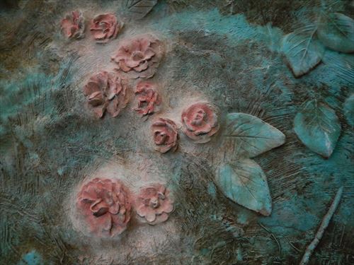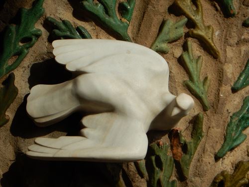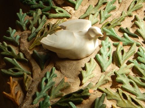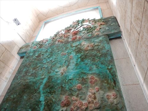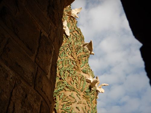 緑の糸杉にハトがとまっている。「永遠の命」を象徴する腐りにくい常緑樹である糸杉、「信者」を象徴するハトを表現。