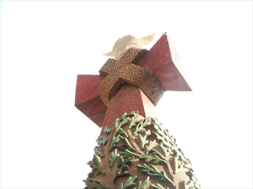 赤い部分がギリシャ語の「神」の頭文字であるT、その真ん中に✖にあるのがキリストのシンボルである十字架、更にその上に載るのが精霊を表す鳩で、