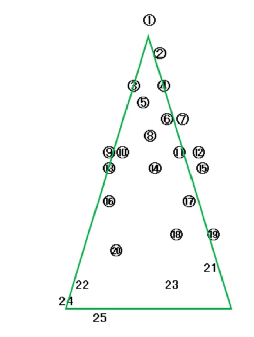 右下から時計周りに21のハト、25のハト、24のハト、22のハト、⑬のハト、③のハト(一番上)、⑤のハト、⑥のハト、14のハト、⑱のハト 21のハト |