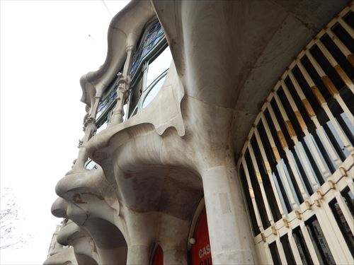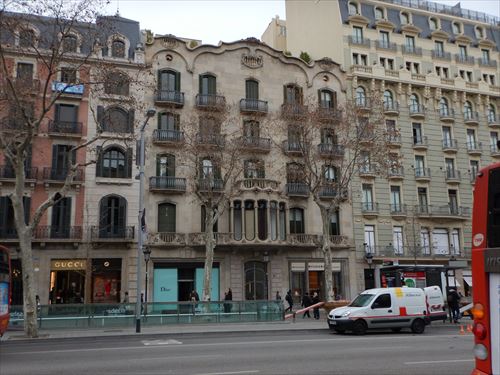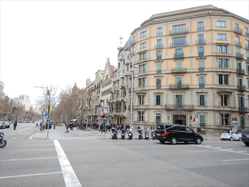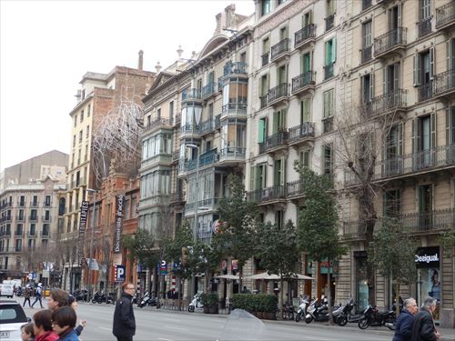 右上の左右の道(ダラゴ通り)を西方向に。凝った出窓のビルが並ぶ。 よく見ると2,3階の窓が他の階より広かったり出窓だったり、またバルコニーが大きかったりそこが建物で一番豪華に作ってある。それはと、建物のオーナー家族が住むフロアー2階と、上階に住む借家人との差を強調する差別化するためのもの。 |