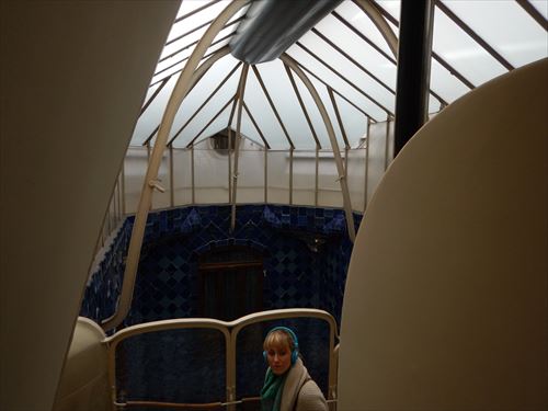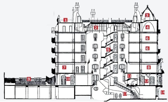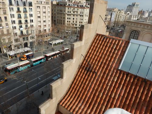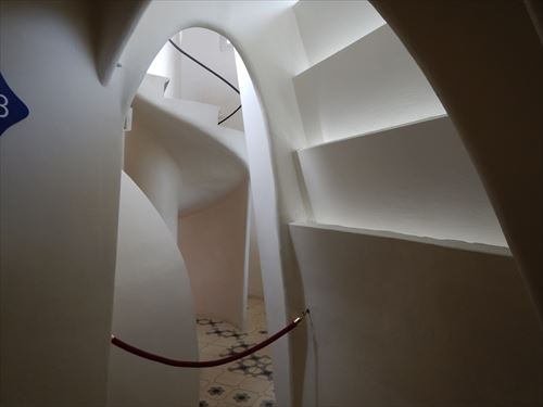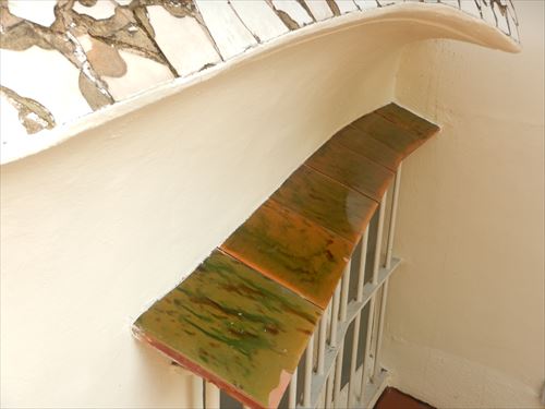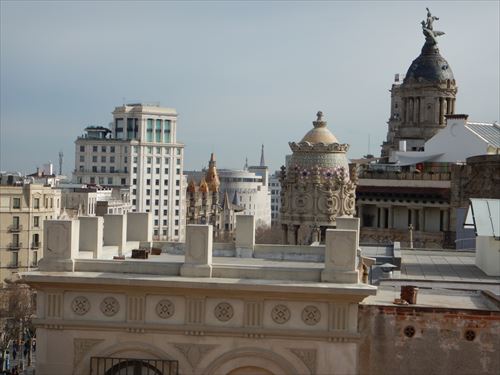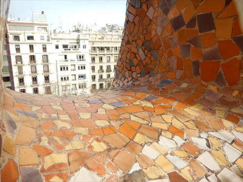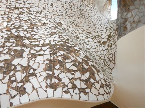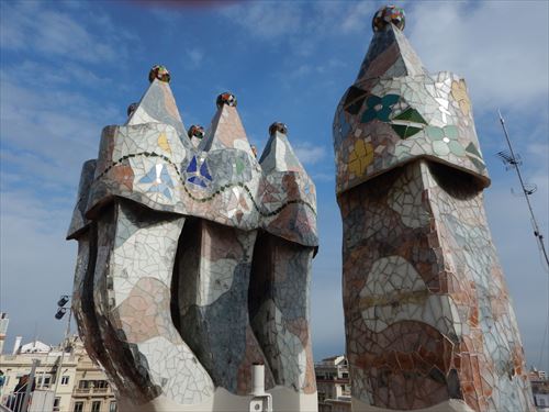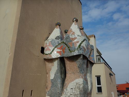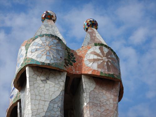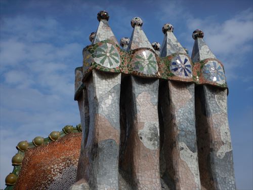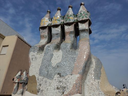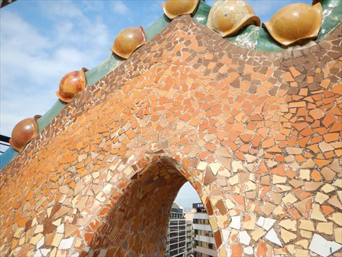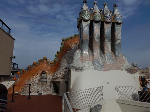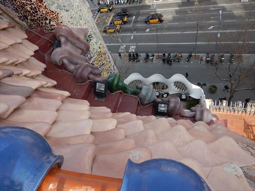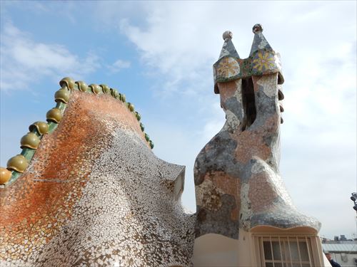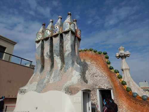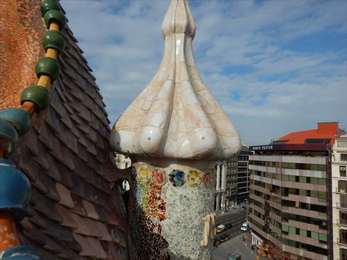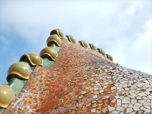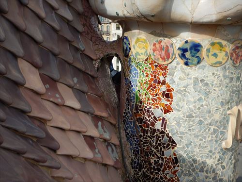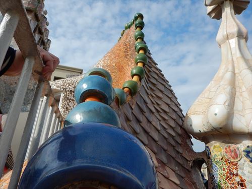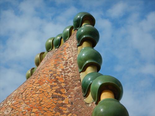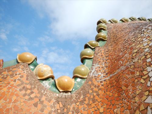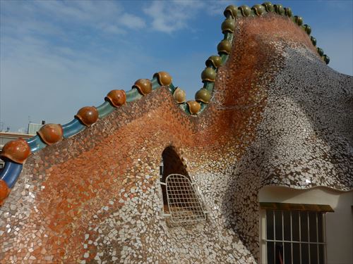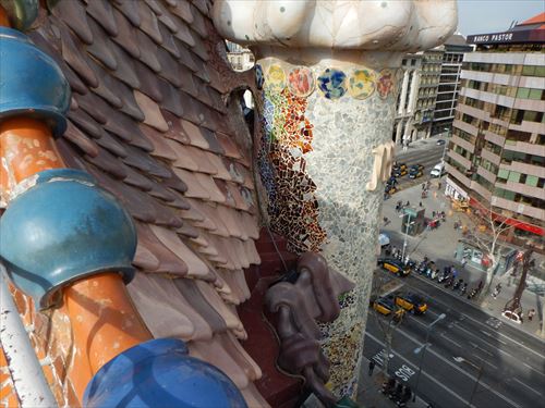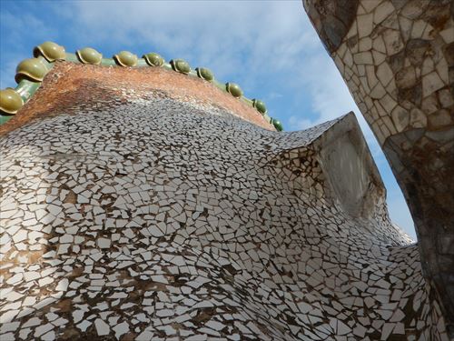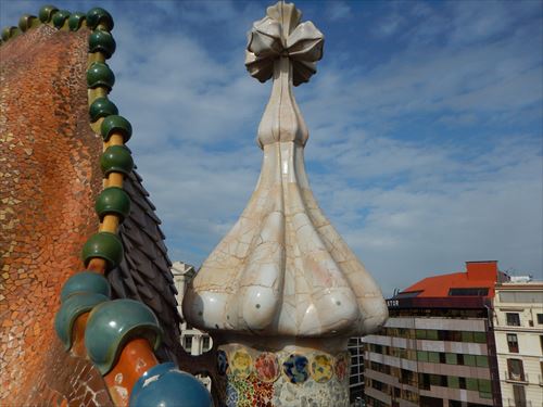 建物の屋根の造形に次の3説がある ①カタルーニャの聖人サンジョルディの伝説にちなみ、ドラゴンに見立てている。石柱が骨、バルコニーが骸骨に見えるので「骨の家(Casa dels Ossos)」とも呼ばれドラゴンの犠牲になった人たちの骨を表している ②屋根をアルルカンの帽子に見たて、バルコニーは仮面、ジュゼップ・マリアジュジョールによる様々な色の破砕タイルが祭りの紙吹雪を表しているとする謝肉祭説。 ③外側の外壁を含めて海をイメージ。 |