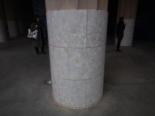 写真の柱の基部には白いトレンカディスが施されている。柱の内側には、雨水を通す管が入っており、市場の真上にある「中央広場」の砂を通ってろ過された雨水が、柱の管に流れ込む仕組みになっていて、市場の下には1200㎡の巨大な貯水槽が設けられている。 |