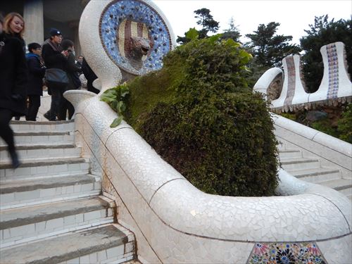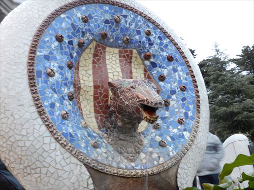 公園の入口正面にある大階段(上の地図③の右)の上部第2の噴水。蛇の頭部とカタルーニャの紋章を組み合わせたメダイヨン(円形の装飾オブジェクト)が置かれている。ヘビのモチーフについて一説では、旧約聖書の中で「モーゼ」が海を二つに分けた時に、杖に巻き付いていた青銅のヘビ(ネフシュタン)だと言われている。 |