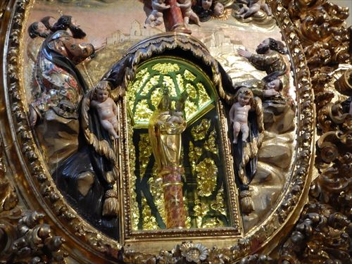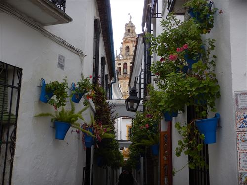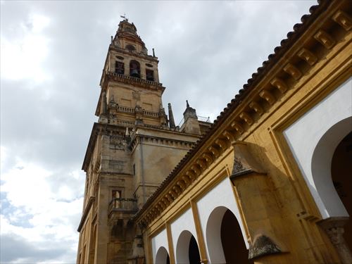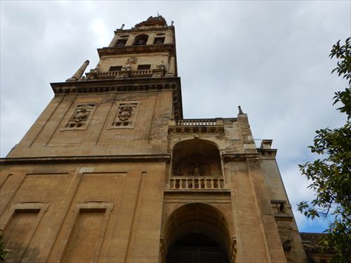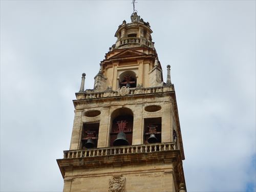 塔楼(アミナール)。イスラムの祈りの時間を伝える歌である「アザーン」を行うため、モスク(イスラム寺院)にはミナレット(塔楼)が建てられている。メスキータのミナレットは「アミナール」または「アルミナール」と呼ばれてきたが、レコンキスタ以降内部にいくつもの鐘が設置され、尖塔の先にはコルドバを守護する聖ラファエルの像が据えられ、鐘楼へと改装された。塔内部は203段の螺旋階段があり、上部のバルコニーまで登ることができる。高さは54mと決して高くはないものの、低層建築の多いコルドバでは群を抜く。
