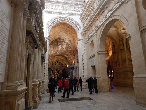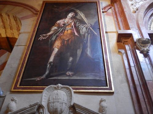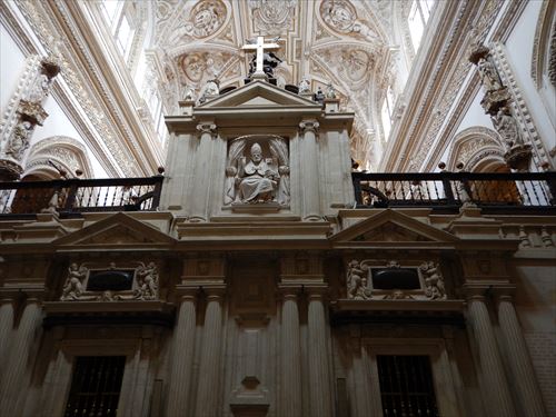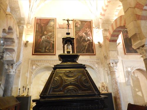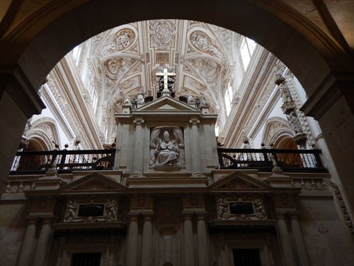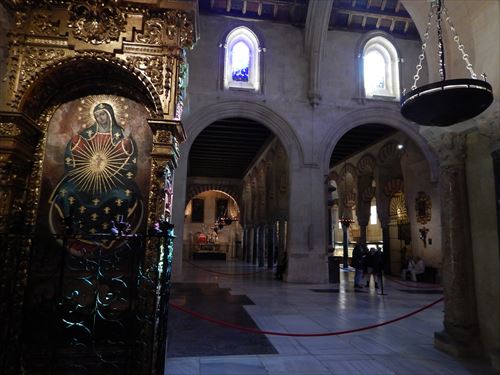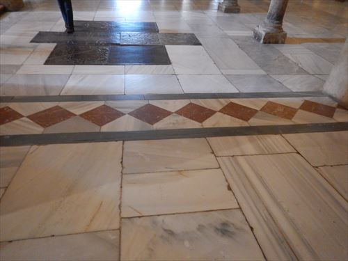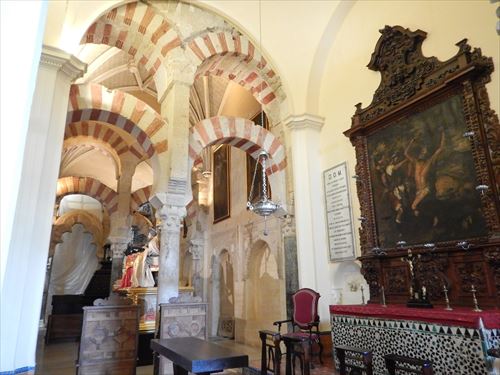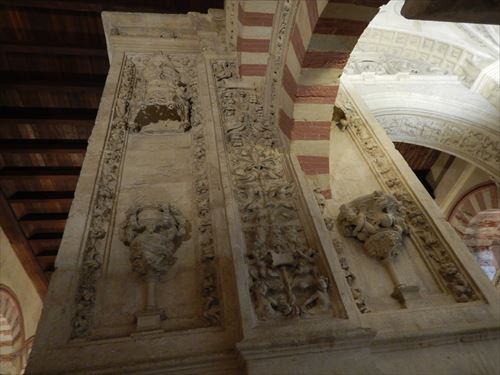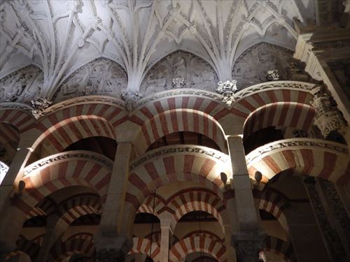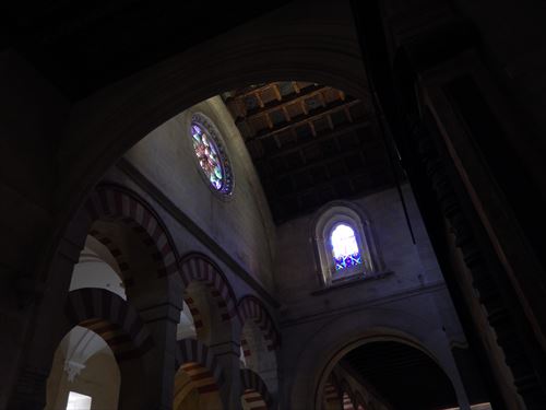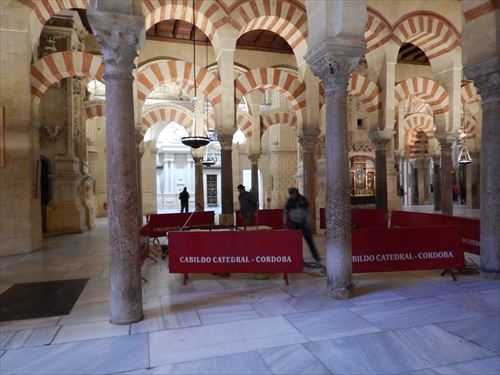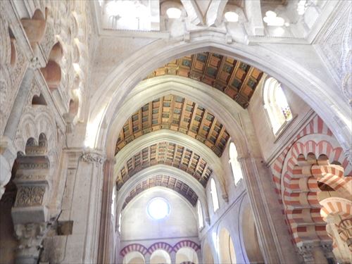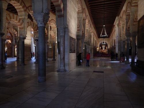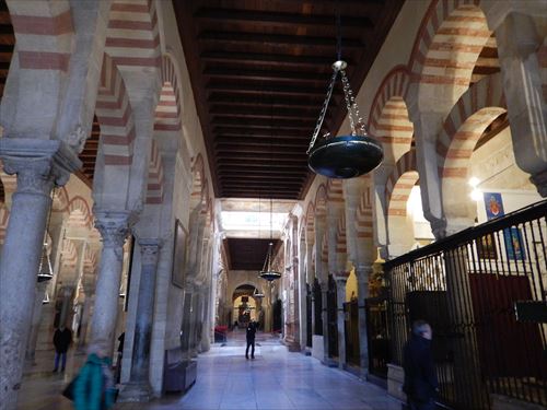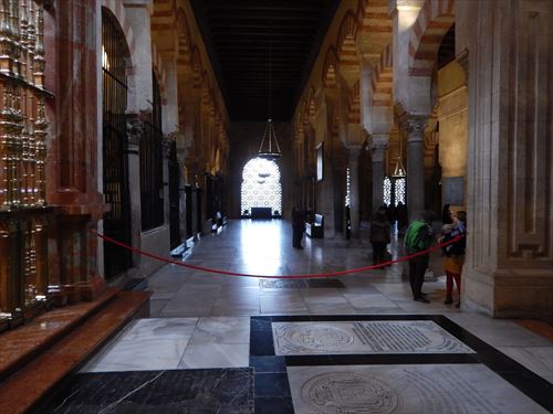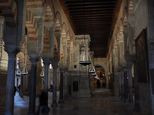 入口からすぐが初期に造られた部分。建設費用を抑える為に、各地から集められたローマ神殿の大理石柱などを再利用しており、台座部分、柱頭部分のデザインや色がマチマチな。天井を支える二重アーチは、石灰岩と赤レンガが使用されており、古代ローマの水道橋のデザインを参考にしたと言われる。