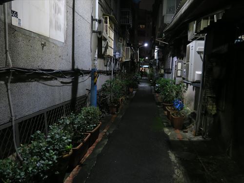 路地には緑の鉢植えが多い。マンションのベランダも同様。 |