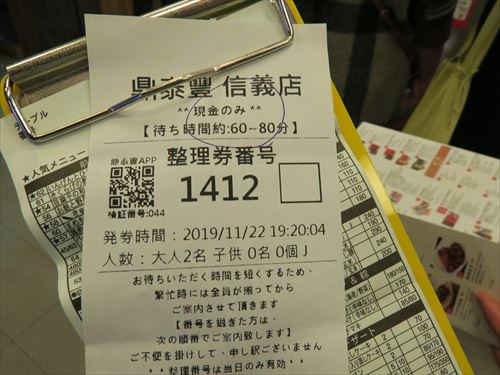 整理券。発券が19:20、この写真を撮ったのが20:27 あ |