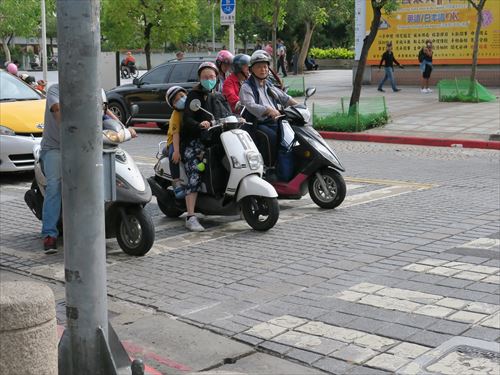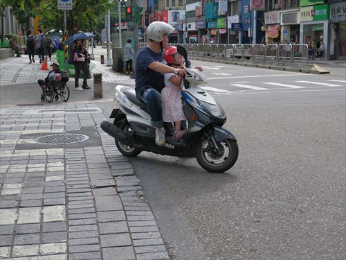 龍山寺から華西街の珍果というフルーツパーラーへ行く途中。子供もちゃんとヘルメットしてる |