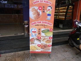 たい焼き1万ドン、中右から下に抹茶チョコどら焼き1.2万ドン、イチゴクリームどら焼き8千ドン、クリームチーズどら焼き1.2万ドン、チョコレートどら焼き1万ドン、チーズどら焼き1万ドン |