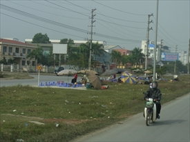 キャノンの工場前は食べ物や靴屋が並ぶ。 |