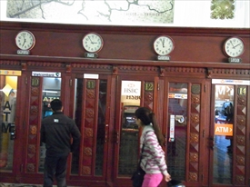 時計は左からモスクワ・東京・北京・ソウル・プレトリア(南アフリカ)。地図はメコン川流域。 |
