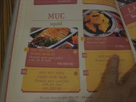イカの塩とチリソース495千ドン、海老天129千ドン |