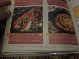 左は春雨と淡水海老の土鍋煮995千ドン、右は土鍋のナスとイカ115千ドン |