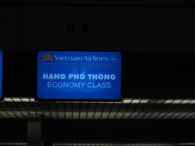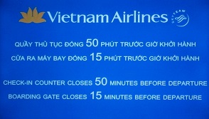 チェックインカウンターは離陸50分前、搭乗口は離陸15分前にクローズする案内。関空でもベトナムエアは厳しいと言っていた。 |