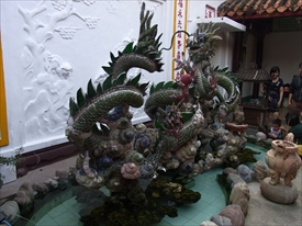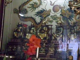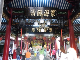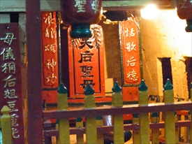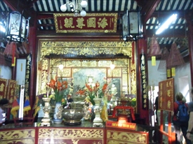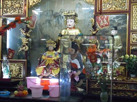 中央の天后聖母は媽祖(まそ)とも呼ばれ、中国南部沿岸部の福建、広東、台湾などの人々によって、航海や漁業の守護神=女神として信仰されていた |