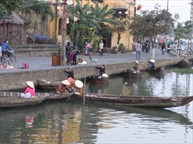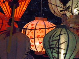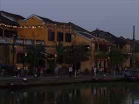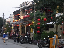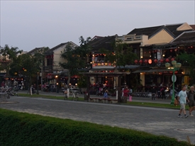 トゥボン川沿いのバクダン通りの店に提灯の明りが点り始める |