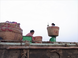 左の下の船の旅行者。手漕ぎは2本の櫂をあやつる。 |